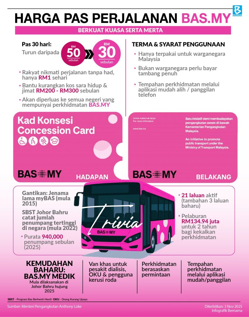 Mulai November 2025, rakyat Malaysia kini boleh menikmati perjalanan tanpa had di bawah perkhidmatan BAS.MY dengan harga pas perjalanan 30 hari yang lebih rendah. Harga pas perjalanan diturunkan daripada RM50 kepada hanya RM30 sebulan.