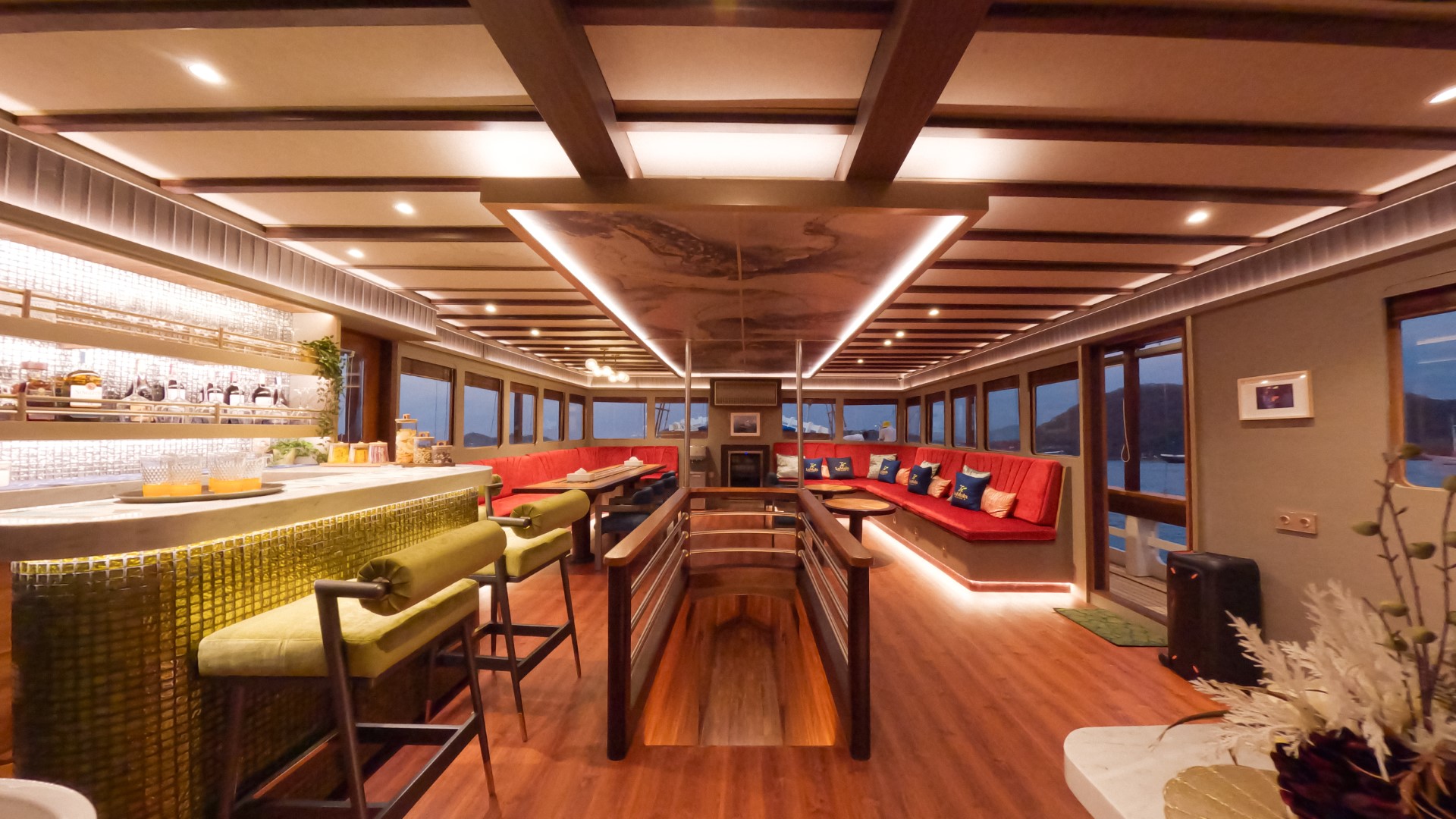 Ruang makan pula luas dan berhawa dingin, lengkap dengan bar kecil, dan kami diberitahu yang makanan akan disajikan 3 kali sehari oleh chef profesional atas kapal. Terdapat juga snack bar & minuman non-alkohol yang boleh diambil free flow bila-bila masa.